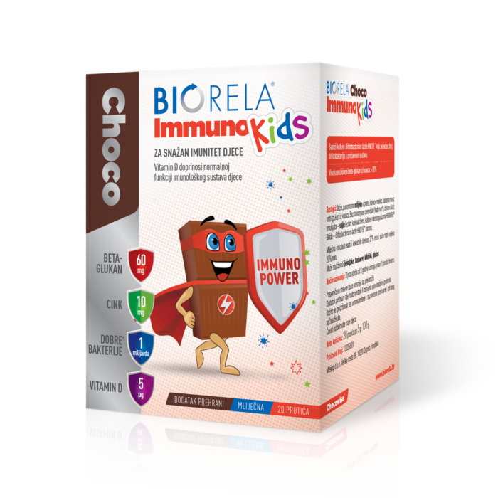 - Prirodni visoko pročišćeni beta-glukani iz kvasca, vitamin D3 i cink u 100% preporučenoj dnevnoj dozi te vrhunska kultura dobrih* bifidobakterija sastojci su Biorele® Choco Immuno Kids koji se uzimaju u obliku prutića od prave mliječne čokolade – jednom dnevno.