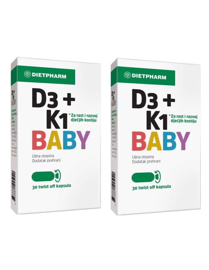 D3 + K1 BABY uljna otopina u twist off kapsulama je dodatak prehrani za nadoknadu vitamina D3 i vitamina K1 kod novorođenčadi i dojenčadi od 8. dana do kraja 12. tjedna starosti.